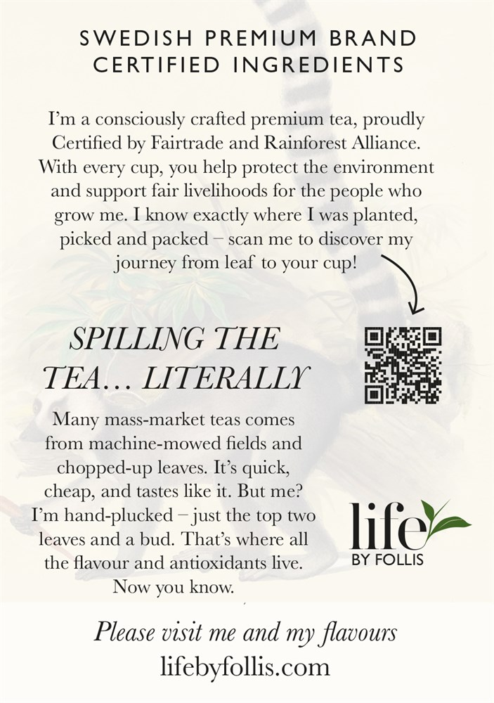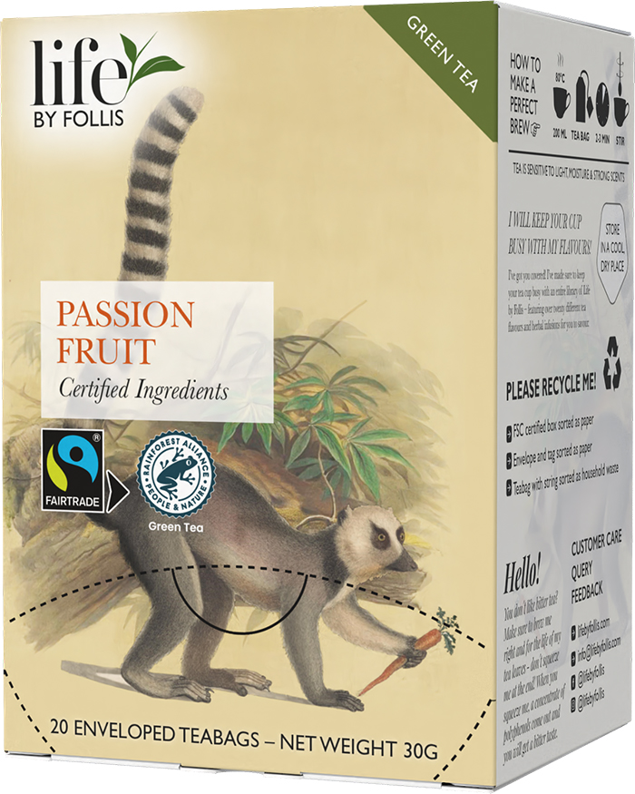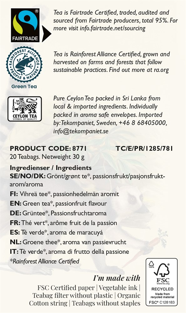 Ett grönt 100% Ceylonte med en fin och frisk not av passionsfrukt. Certifierat Fairtrade och Rainforest Alliance.